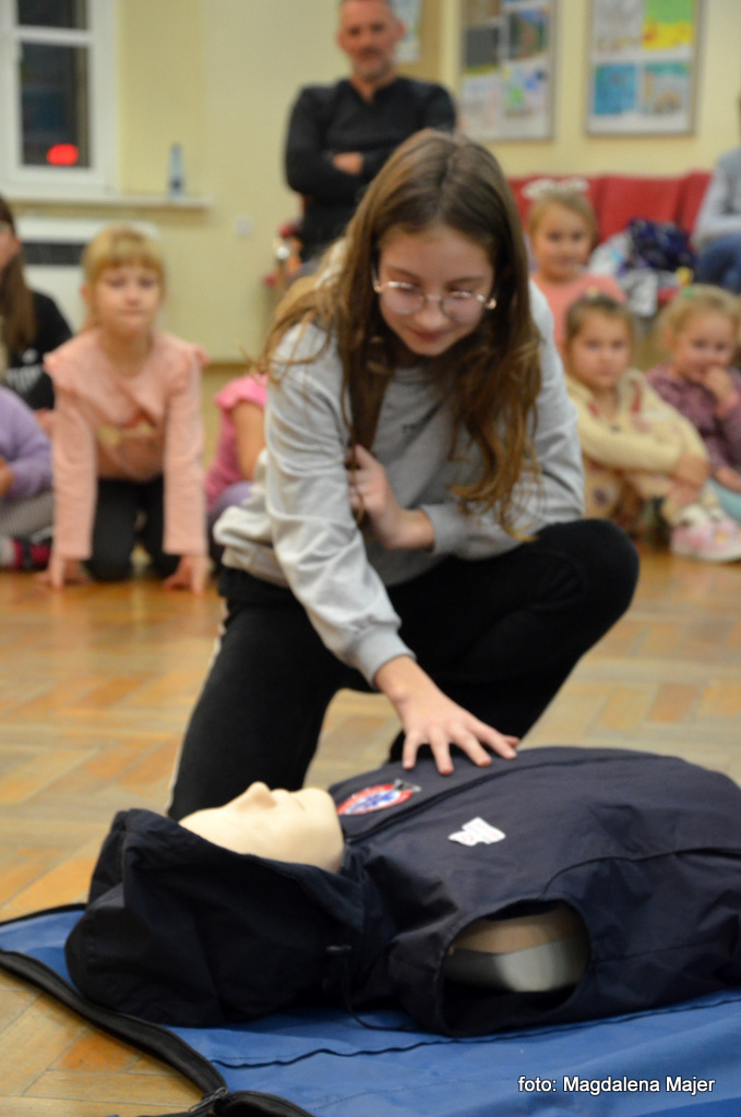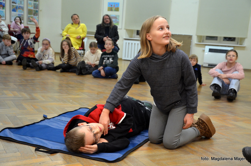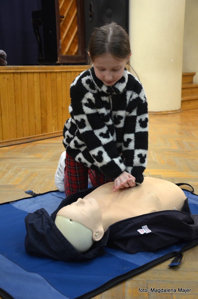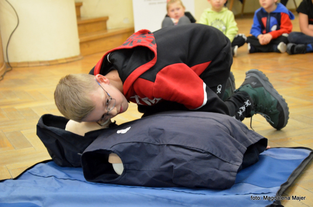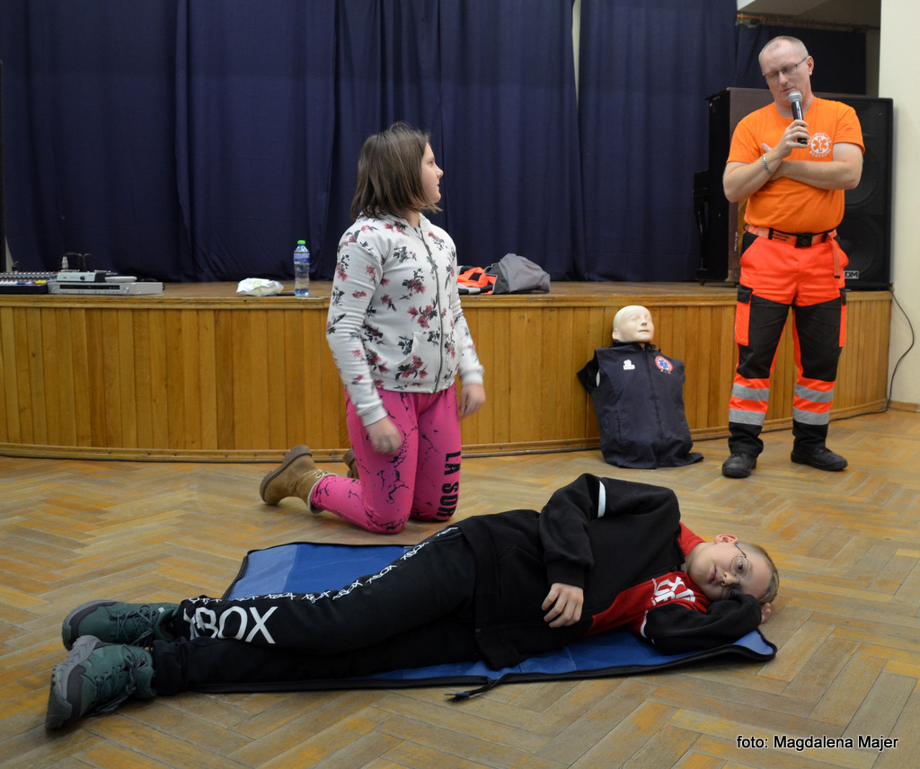 Dzieci i młodzież chętnie uczestniczyły w praktycznej części spotkania, ucząc się ułożenia w tzw. “pozycji bocznej ustalonej” oraz zasad resuscytacji. Salę Widowiskową opuściliśmy bogatsi o niewątpliwie przydatną wiedzę.