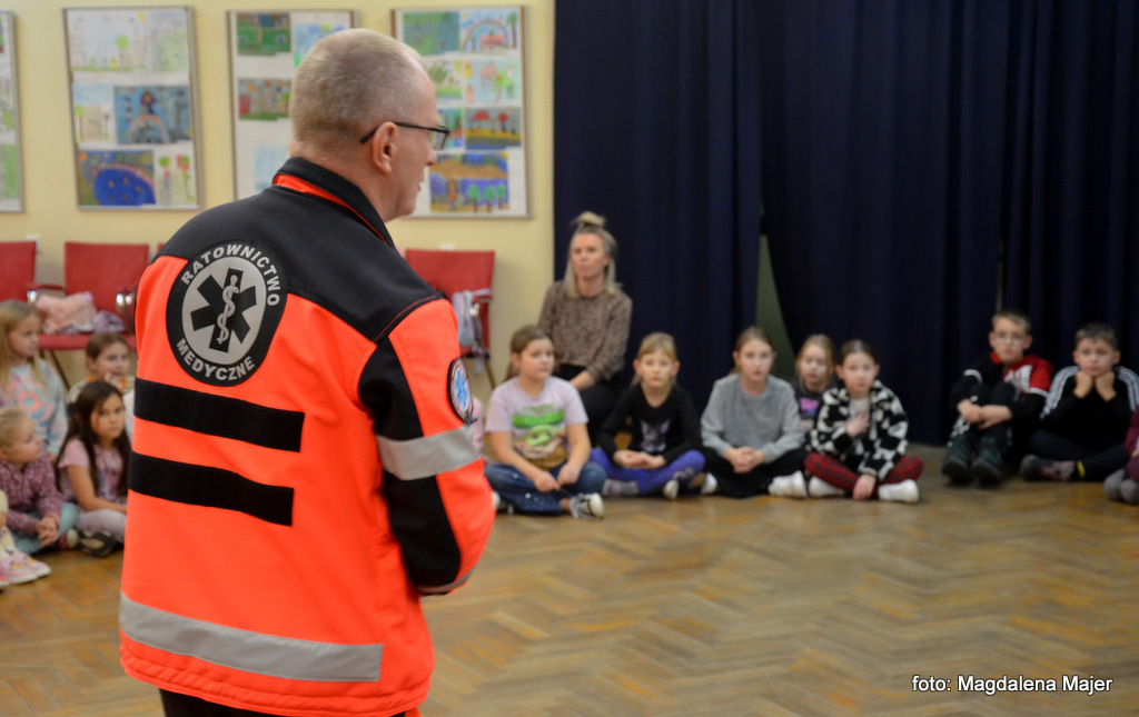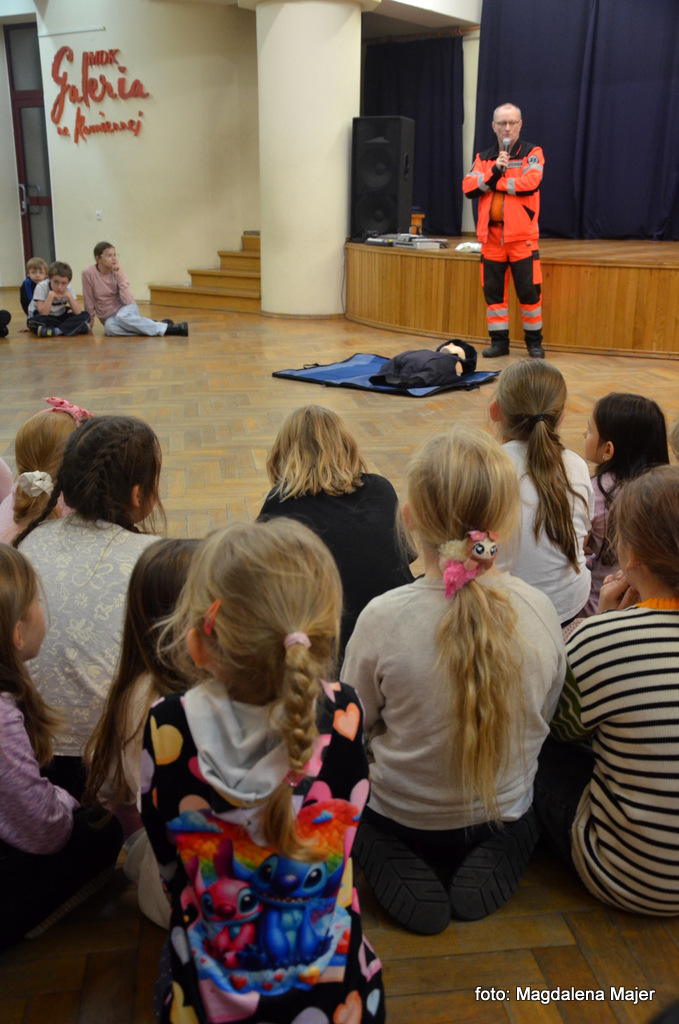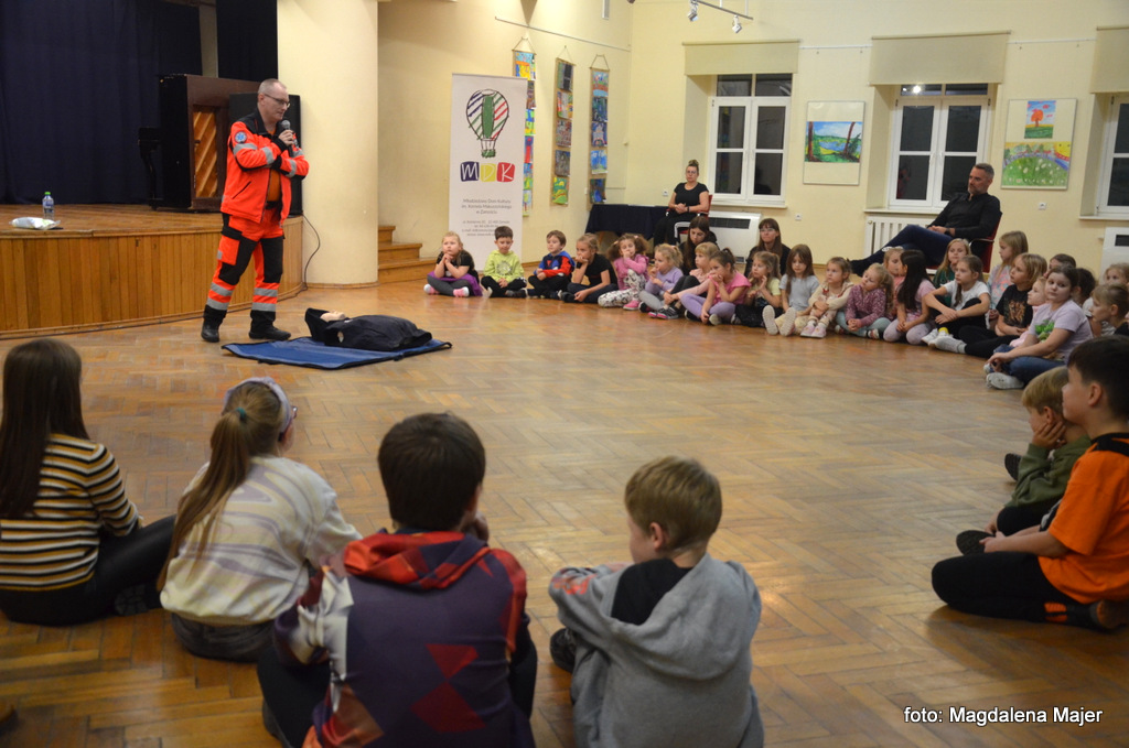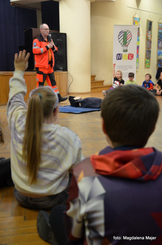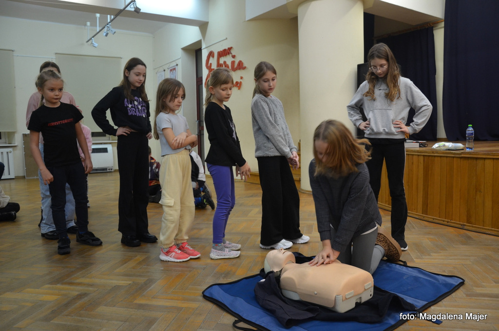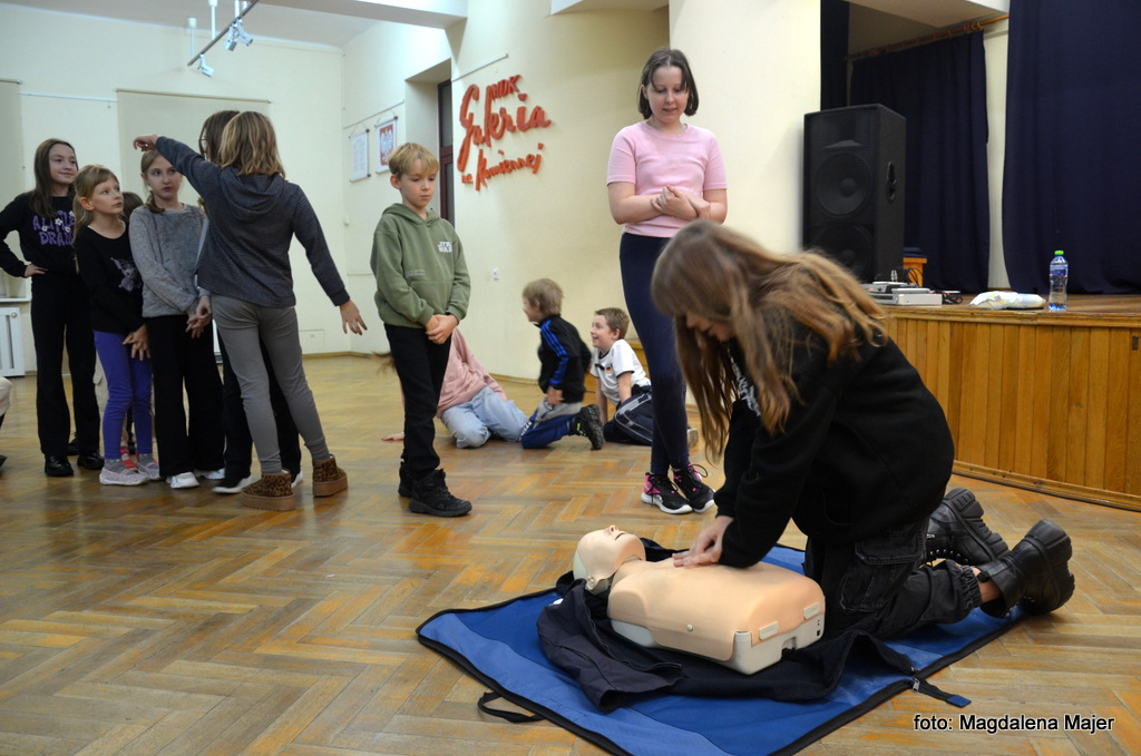 Dzieci i młodzież chętnie uczestniczyły w praktycznej części spotkania, ucząc się ułożenia w tzw. “pozycji bocznej ustalonej” oraz zasad resuscytacji. Salę Widowiskową opuściliśmy bogatsi o niewątpliwie przydatną wiedzę.