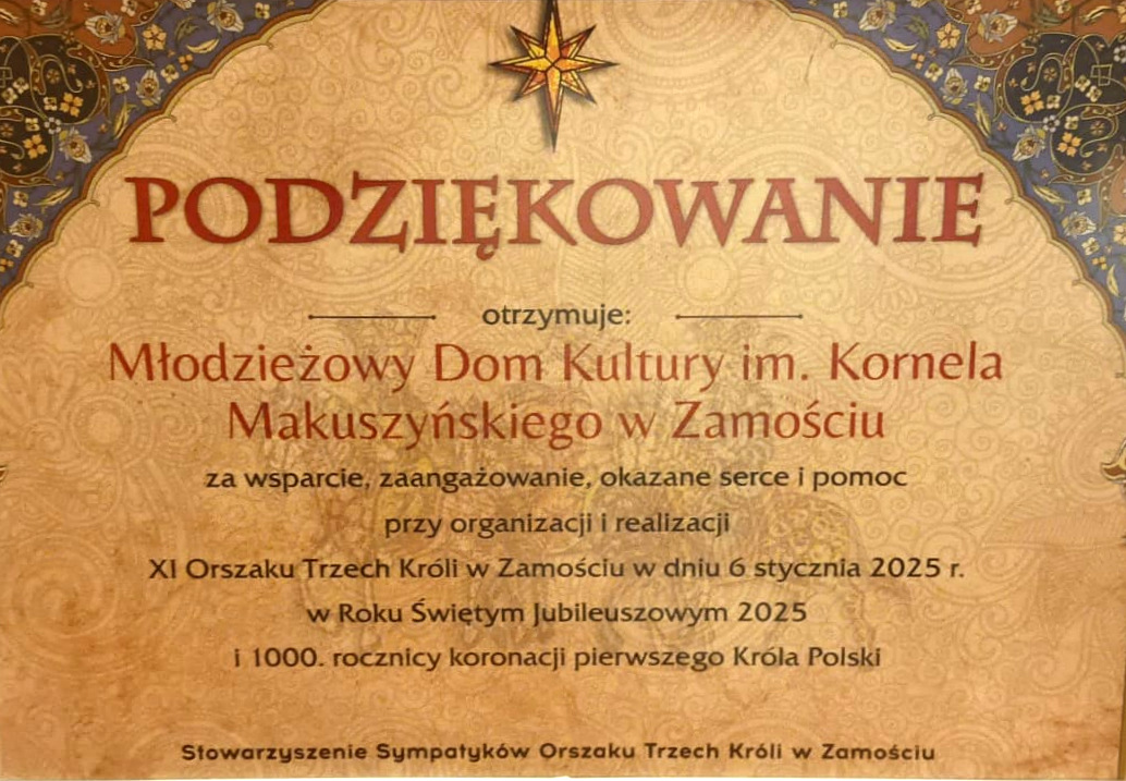 We czwartek 30 stycznia w Centrum Kultury Filmowej “Stylowy” w Zamościu podsumowano kolejną edycję Orszaku Trzech Króli. Zamojski MDK od lat angażuje się w to przedsięwzięcie służąc pomocą przy scenografii i biorąc udział w wydarzeniu. Podczas uroczystego podsumowania placówkę reprezentował Dyrektor- Paweł Kołodziejczyk, który z rąk pani Małgorzaty Farion- Prezes Stowarzyszenia Sympatyków Orszaku Trzech Króli w Zamościu, odebrał podziękowanie dla Młodzieżowego Domu Kultury.