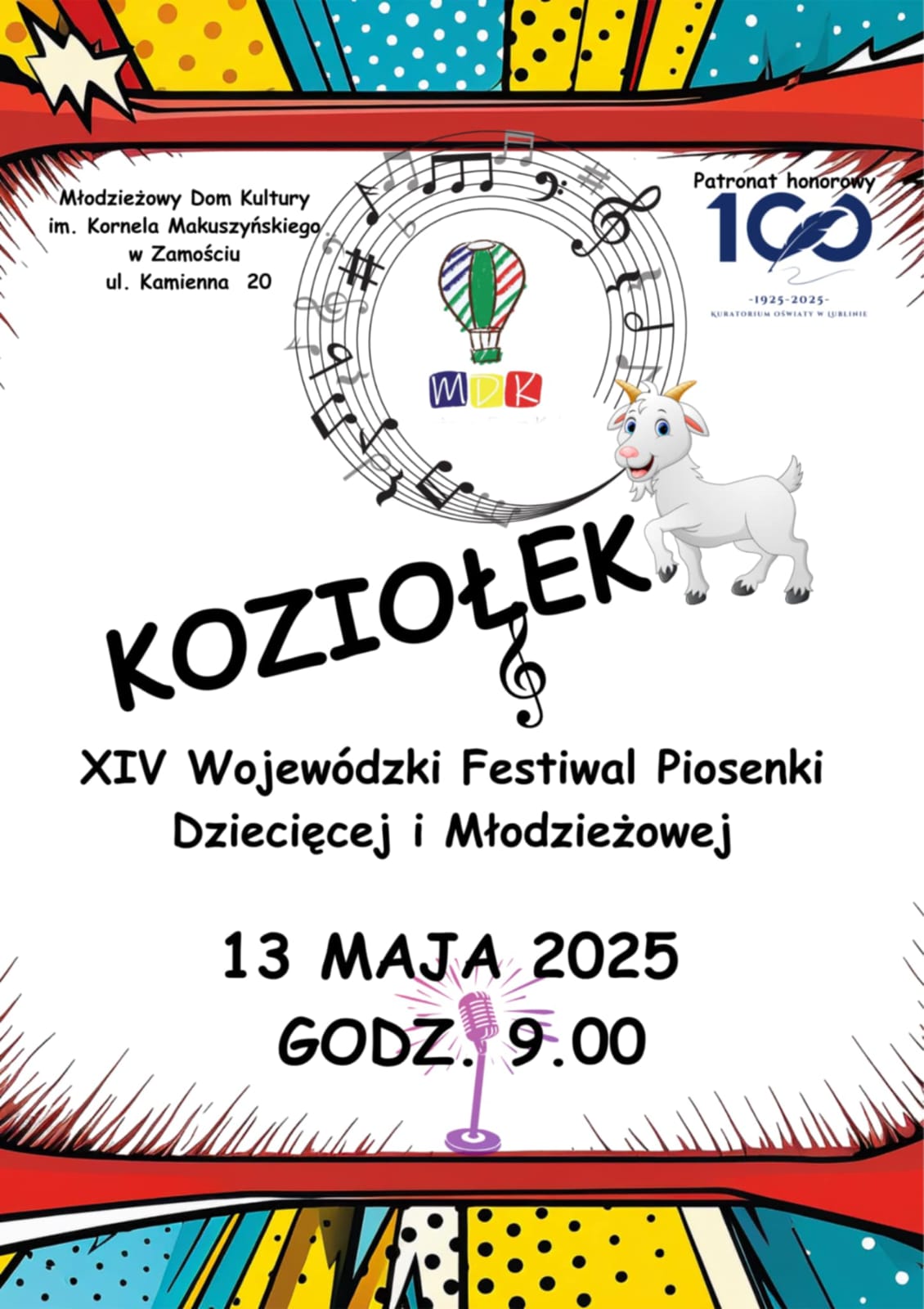 Zapraszamy do udziału w XIV Wojewódzkim Festiwalu Piosenki Dziecięcej i Młodzieżowej „Koziołek” – Zamość 2025 r., zaplanowanym na 13 maja 2025 roku.