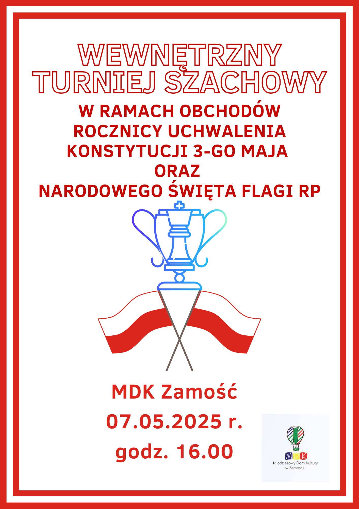 Jeśli jesteś wychowankiem MDK i grasz w szachy, a celebrowanie świąt patriotycznych jest dla Ciebie ważne- weź udział w Wewnętrznym Turnieju organizowanym przez MDK w Zamościu.