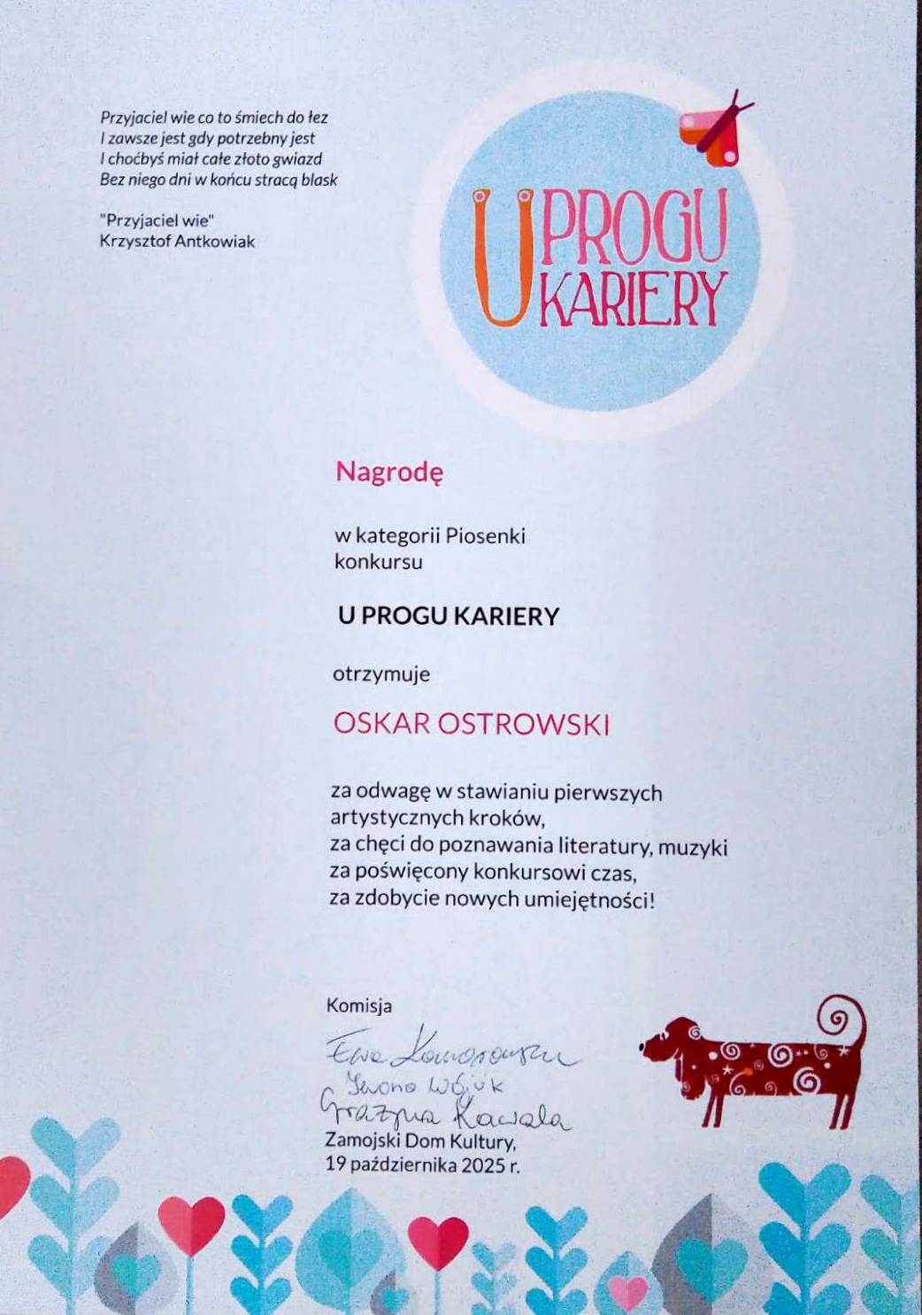 “Jak ważna jest przyjaźń” – pod takim hasłem ZDK zorganizował w tym roku konkurs dla dzieci przedszkolnych pt. “U progu kariery”. Przesłuchania do koncertu finałowego odbyły się 12 października. Natomiast w niedzielę 19 października na deskach Zamojskiego Domu Kultury odbyła się Gala Finałowa w/w konkursu, gdzie nagrodę zdobył wychowanek zajęć rytmiczno- wokalnych Oskar Ostrowski. Nauczycielem młodego wokalisty jest Paweł Kołodziejczyk.