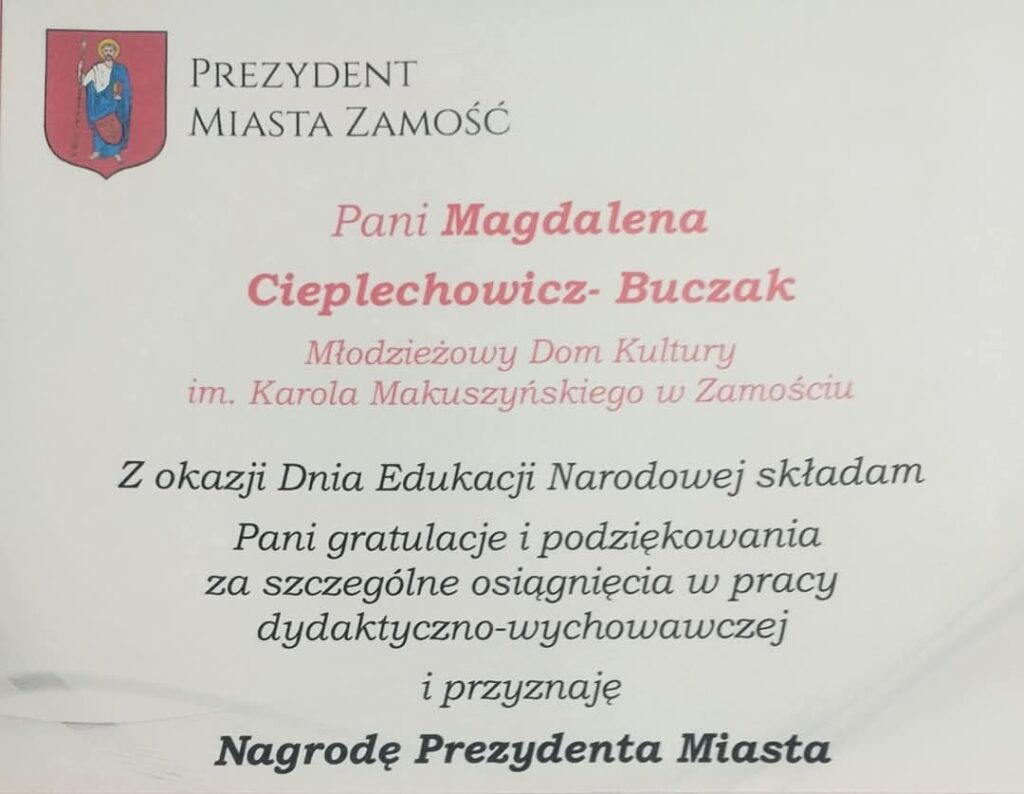 W dniu 17 października 2025r. z okazji Dnia Edukacji Narodowej Prezydent Miasta Zamość pan Rafał Zwolak wręczył nagrody za osiągnięcia w pracy dydaktycznej, wychowawczej i opiekuńczej. Wśród nagrodzonych pracowników szkół i placówek naszego miasta znalazła się nauczycielka Młodzieżowego Domu Kultury im. K. Makuszyńskiego pani Magdalena Cieplechowicz – Buczak.