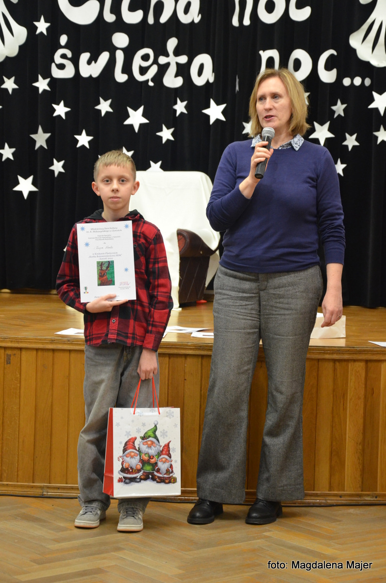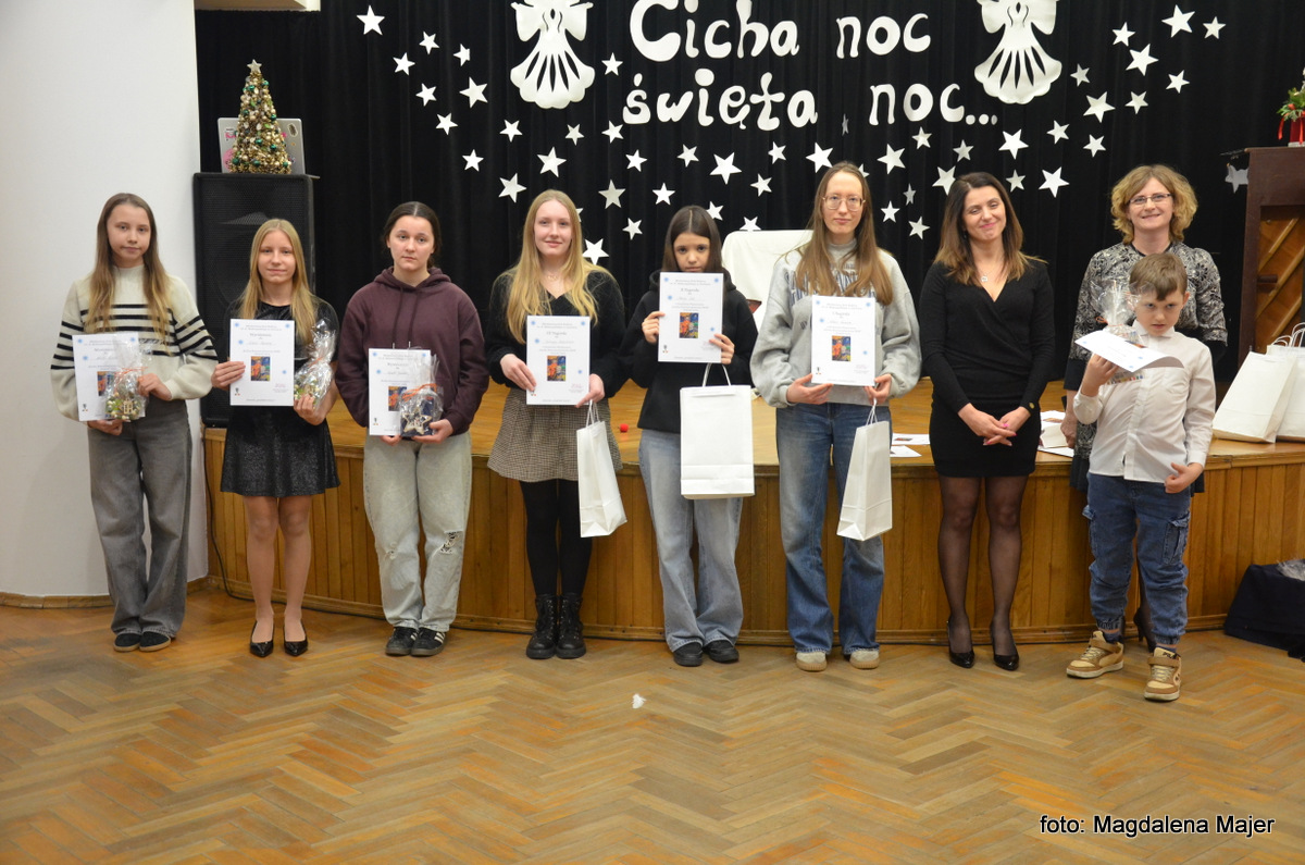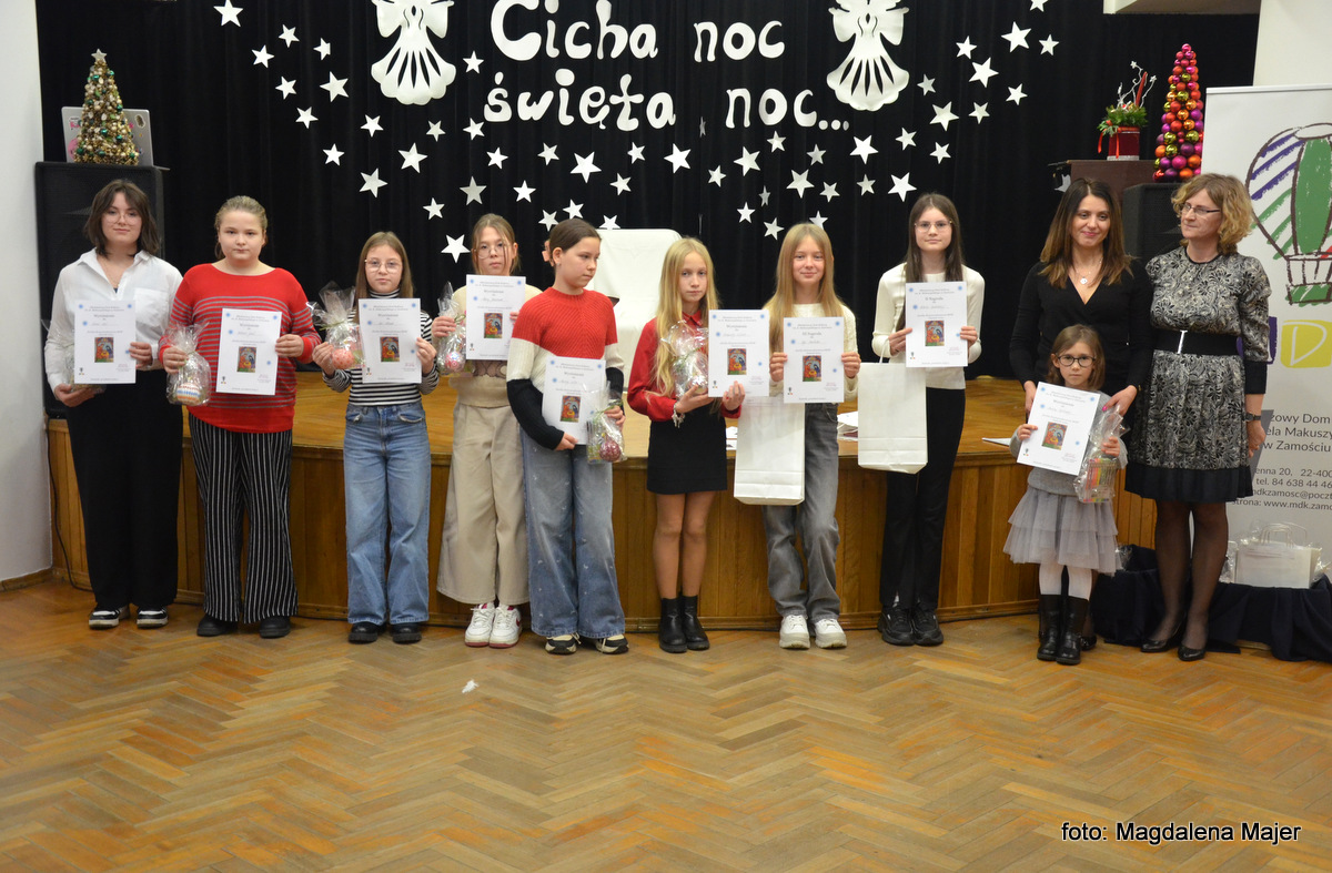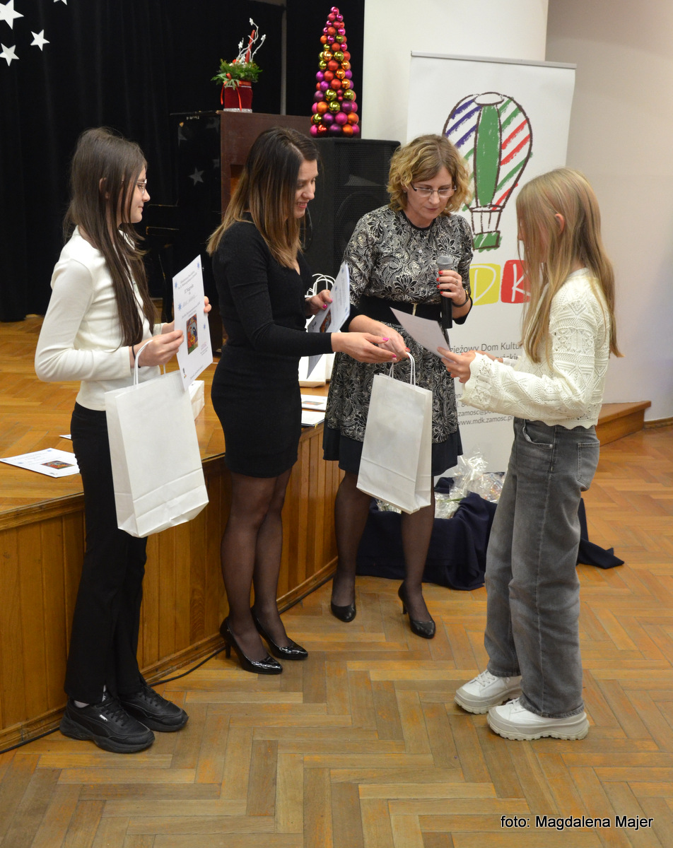 Wieczór wigilijny był również okazją do wręczenia nagród za udział w konkursie na kartkę bożonarodzeniową koordynowanym przez panią Wiolettę Brzozowską. Wszyscy uczestnicy konkursu otrzymali dyplomy i upominki, ufundowane przez Radę Rodziców oraz Nagrodę Specjalną ufundowaną przez Muzeum Zamojskie w Zamościu. Kreatywność uczestników przeszła najśmielsze oczekiwania – jury miało niełatwe zadanie, a nagrodzone prace zachwyciły pomysłowością i świątecznym klimatem.