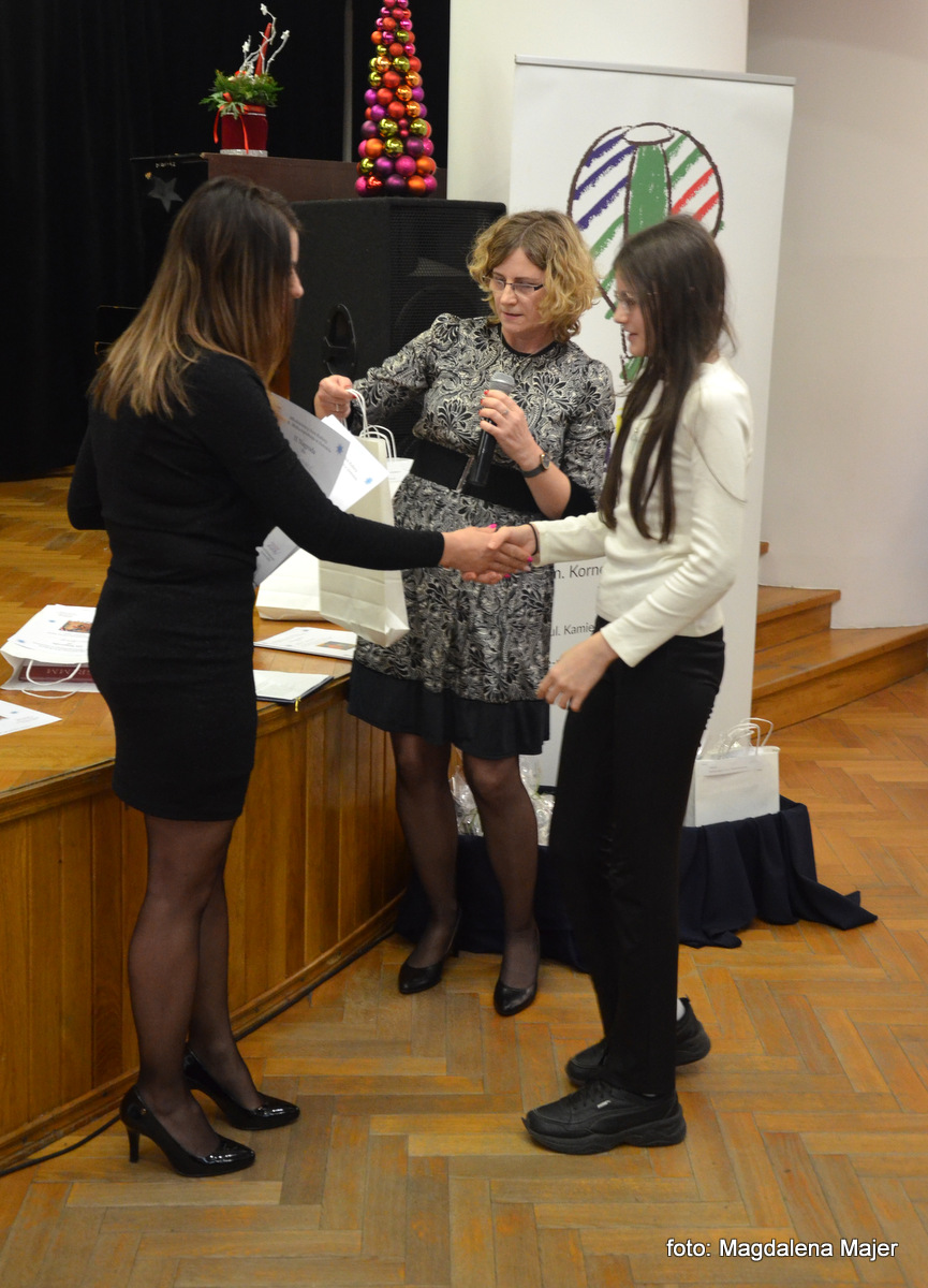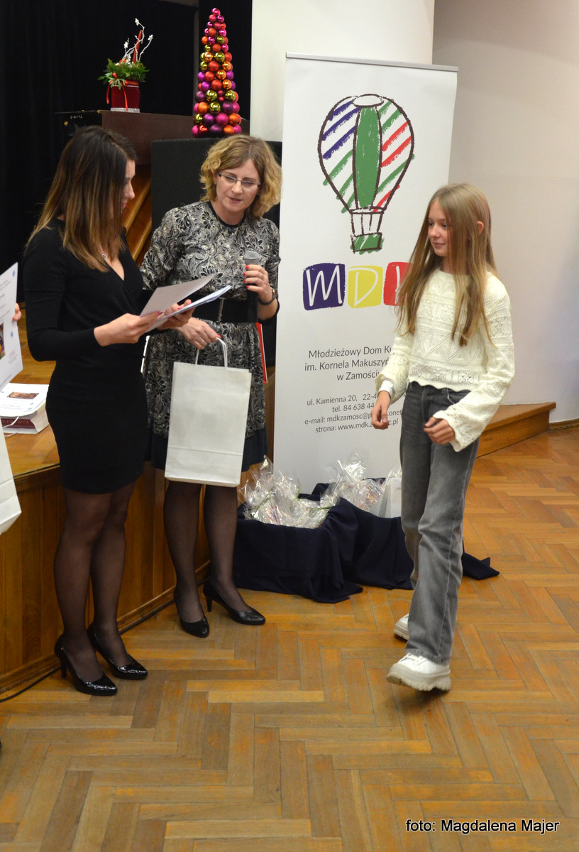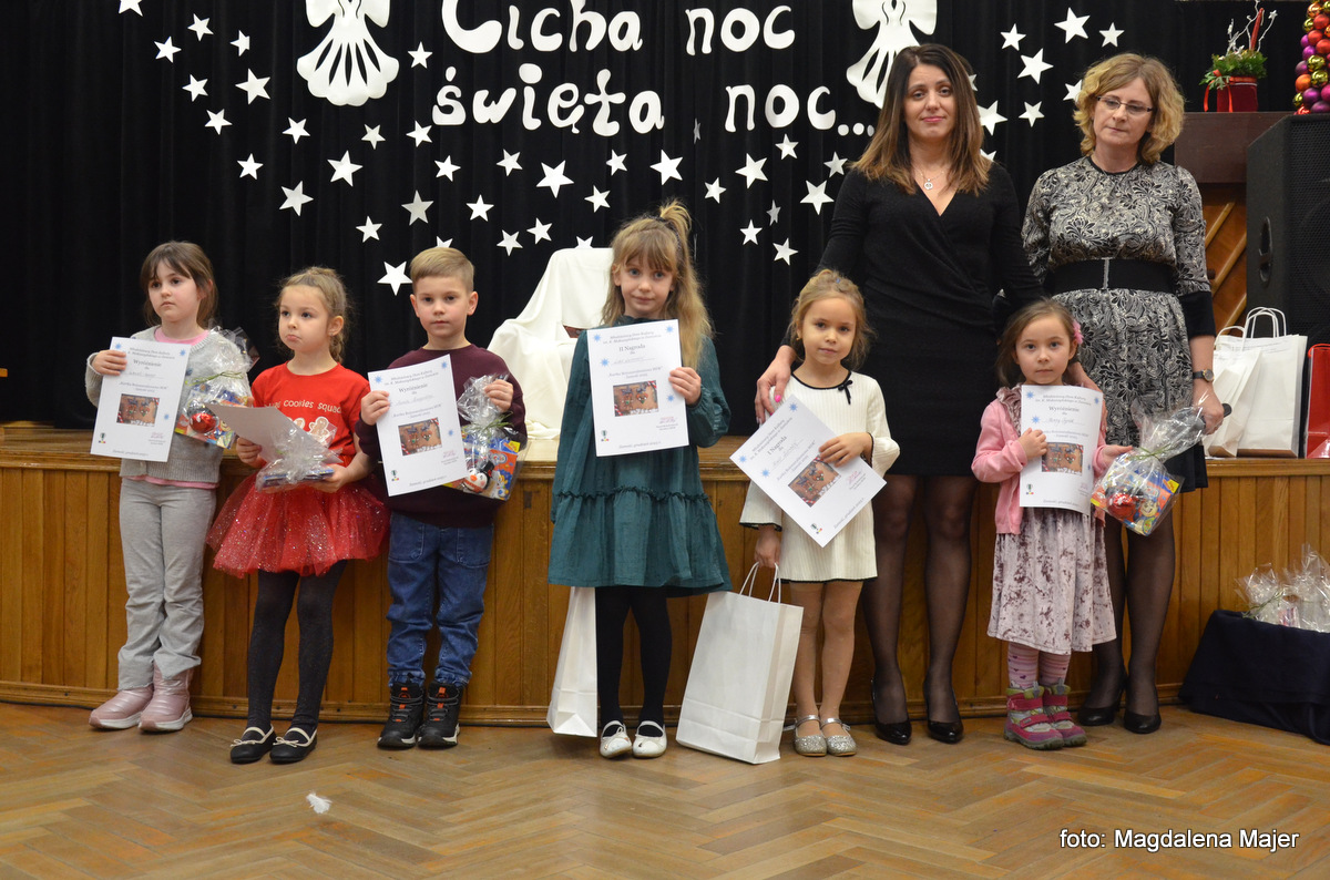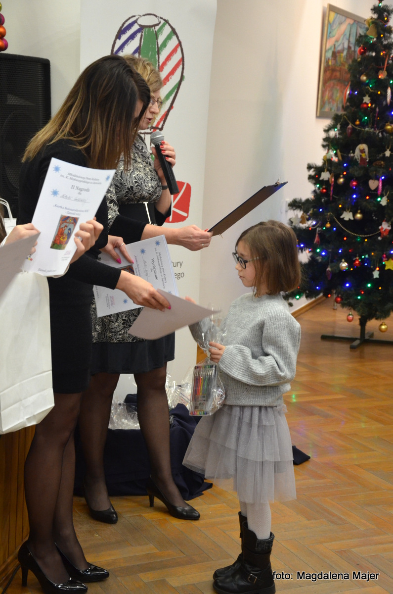 Wieczór wigilijny był również okazją do wręczenia nagród za udział w konkursie na kartkę bożonarodzeniową koordynowanym przez panią Wiolettę Brzozowską. Wszyscy uczestnicy konkursu otrzymali dyplomy i upominki, ufundowane przez Radę Rodziców oraz Nagrodę Specjalną ufundowaną przez Muzeum Zamojskie w Zamościu. Kreatywność uczestników przeszła najśmielsze oczekiwania – jury miało niełatwe zadanie, a nagrodzone prace zachwyciły pomysłowością i świątecznym klimatem.