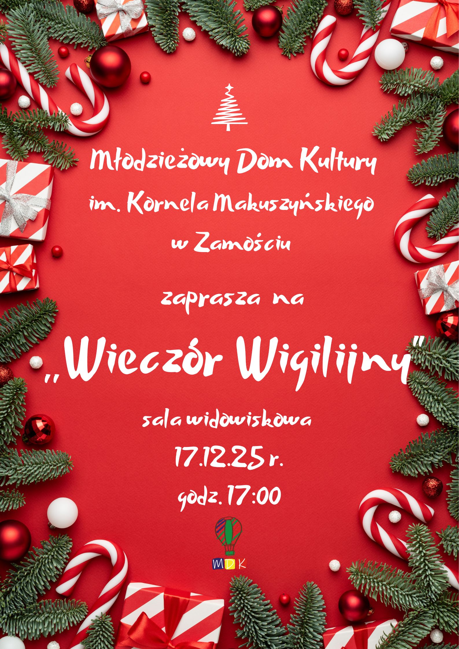 Serdecznie zapraszamy na wyjątkowy „Wieczór Wigilijny” organizowany w Młodzieżowym Domu Kultury w dniu17 grudnia 2025 r. (środa) godzina 17:00