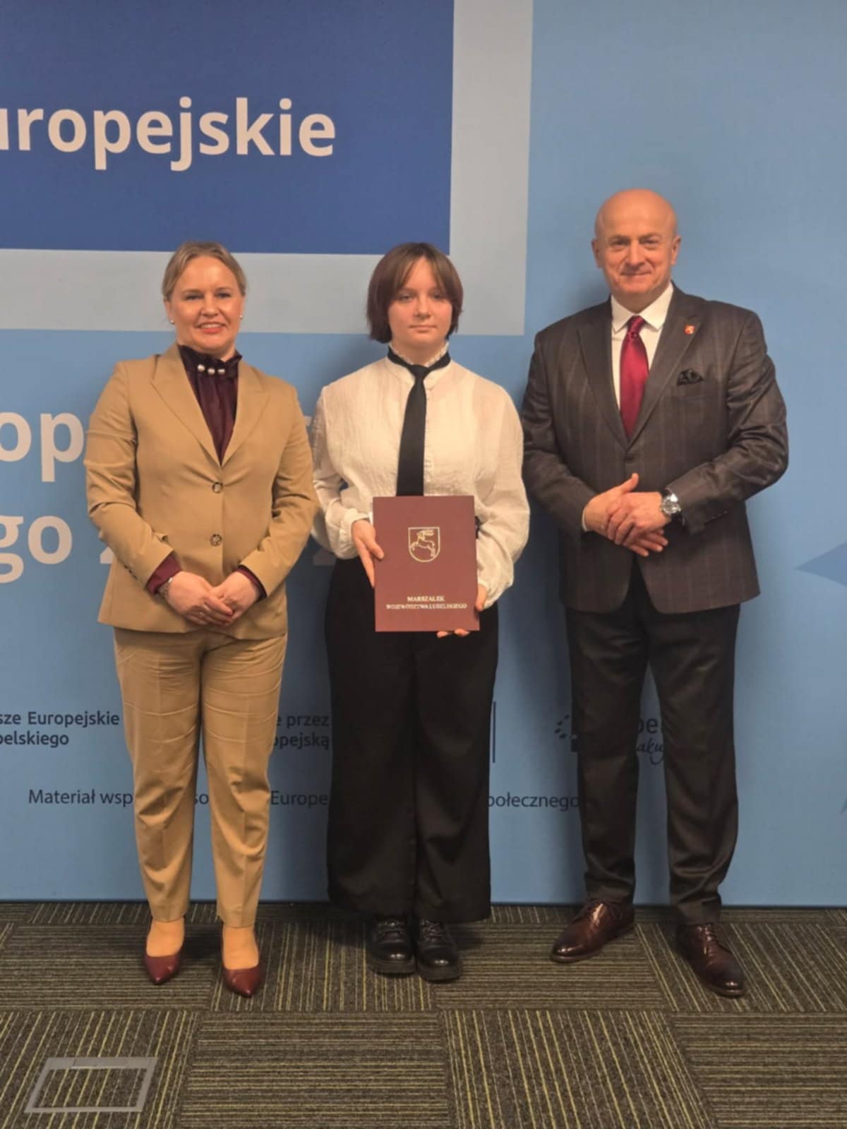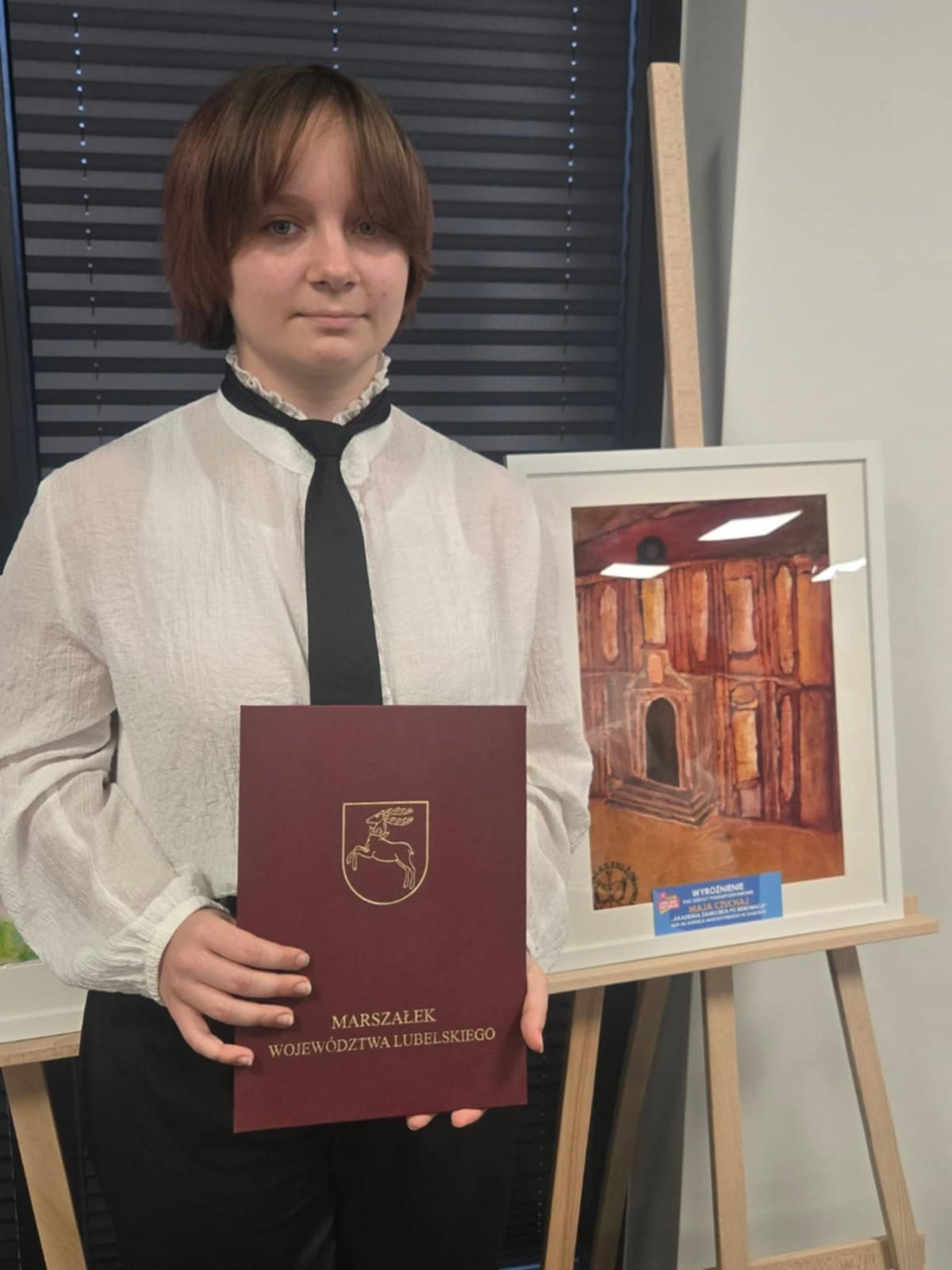 W dniu 9 grudnia 2025r. w siedzibie Lubelskiej Agencji Wspierania Przedsiębiorczości w Lublinie Marszałek Województwa Lubelskiego pan Jarosław Stawiarski wręczył nagrody laureatom i wyróżnionym w 6. edycji konkursu plastycznego „Lubelskie Pięknieje”. Miło nam poinformować, że wśród nagrodzonych znalazła się wychowanka MDK Zamość – Maja Czuchaj. Maja uczęszcza na zajęcia batiku wielobarwnego prowadzonego przez panią Magdalenę Cieplechowicz – Buczak. Gratulujemy