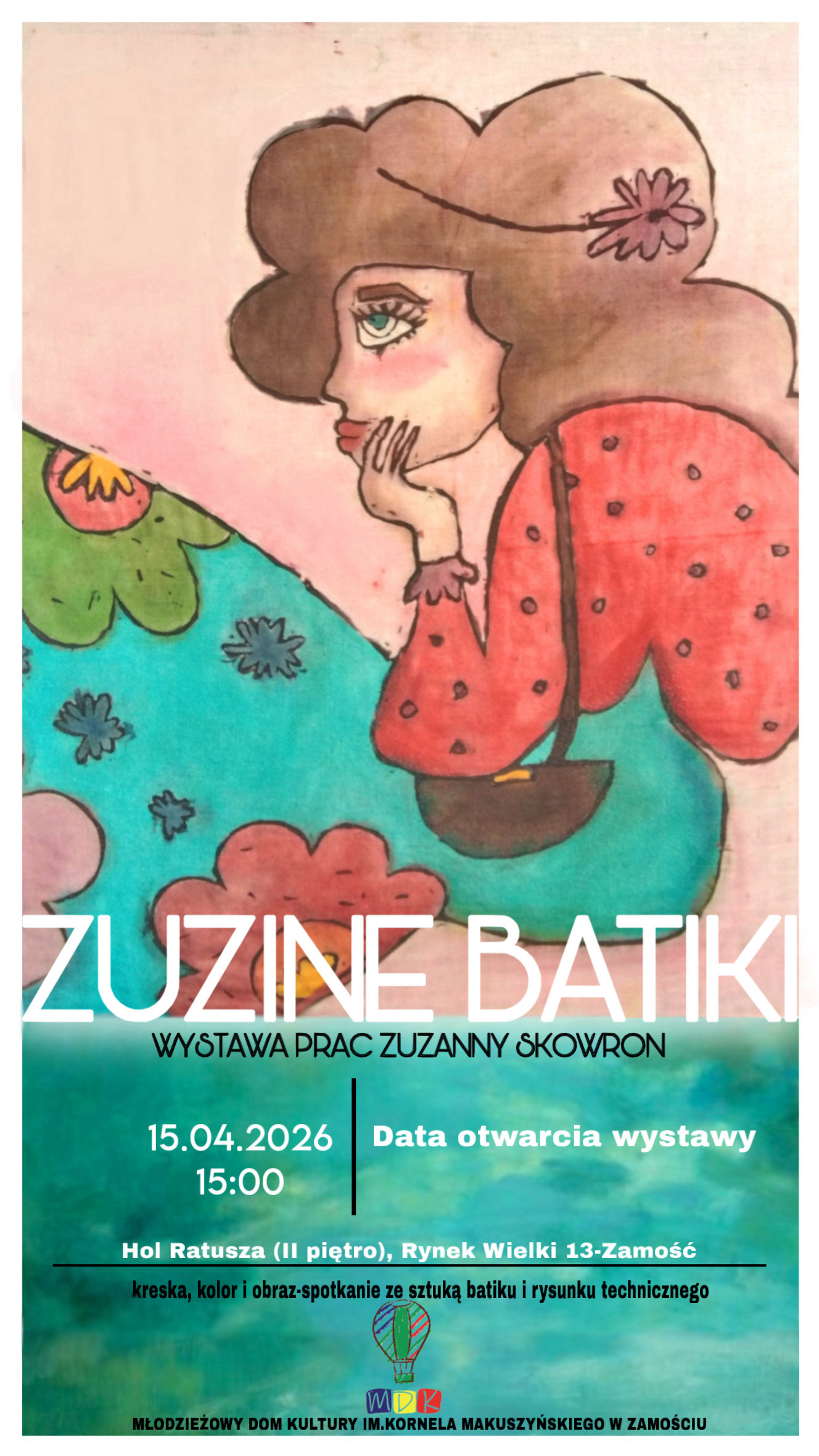 Młodzieżowym Domu Kultury im. Kornela Makuszyńskiego zaprasza na otwarcie wystawy wychowanki Zuzanny Skowron, która uczęszcza na zajęcia batiku wielobarwnego.